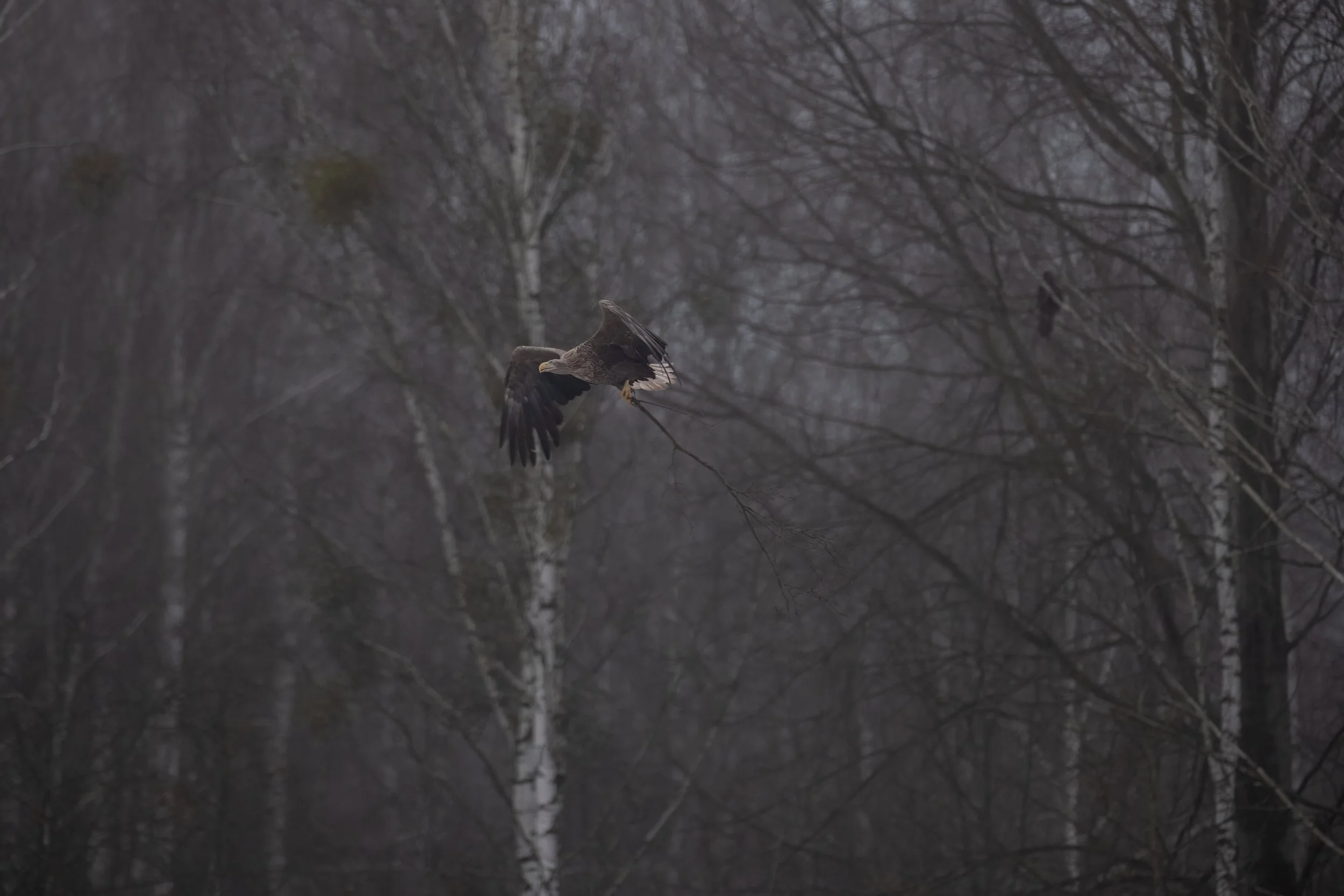 White Tailed Sea Eagles, once prolific over Europe are now a rare sighting. One grey morning, sitting in a hide, I noticed a pair of Eagles in the distance up in a tree. The larger, male, flew off, and came back caring a branch in its talons.