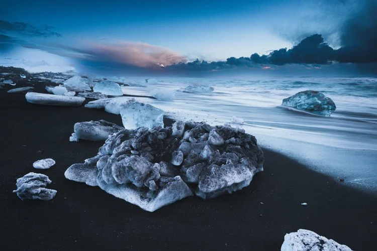 Ice fascinates me. If you look towards the right of this image, the blue ice in the water looks like a beautiful, sparkling gem. Now take a look at the ice formation on the beach. In addition to the beautiful shapes, it’s kinda dirty. It’s not just any ole dirt. You see, ice can take a while to form, to build up all the layers. What we’re looking at is the past. Maybe some of the “dirt” in the ice came from Eyjafjallajökull, the volcano erupted in 920, 1612 and 1821–23 and recently in 2010. Maybe I should have paid more attention in Geology class in High School…