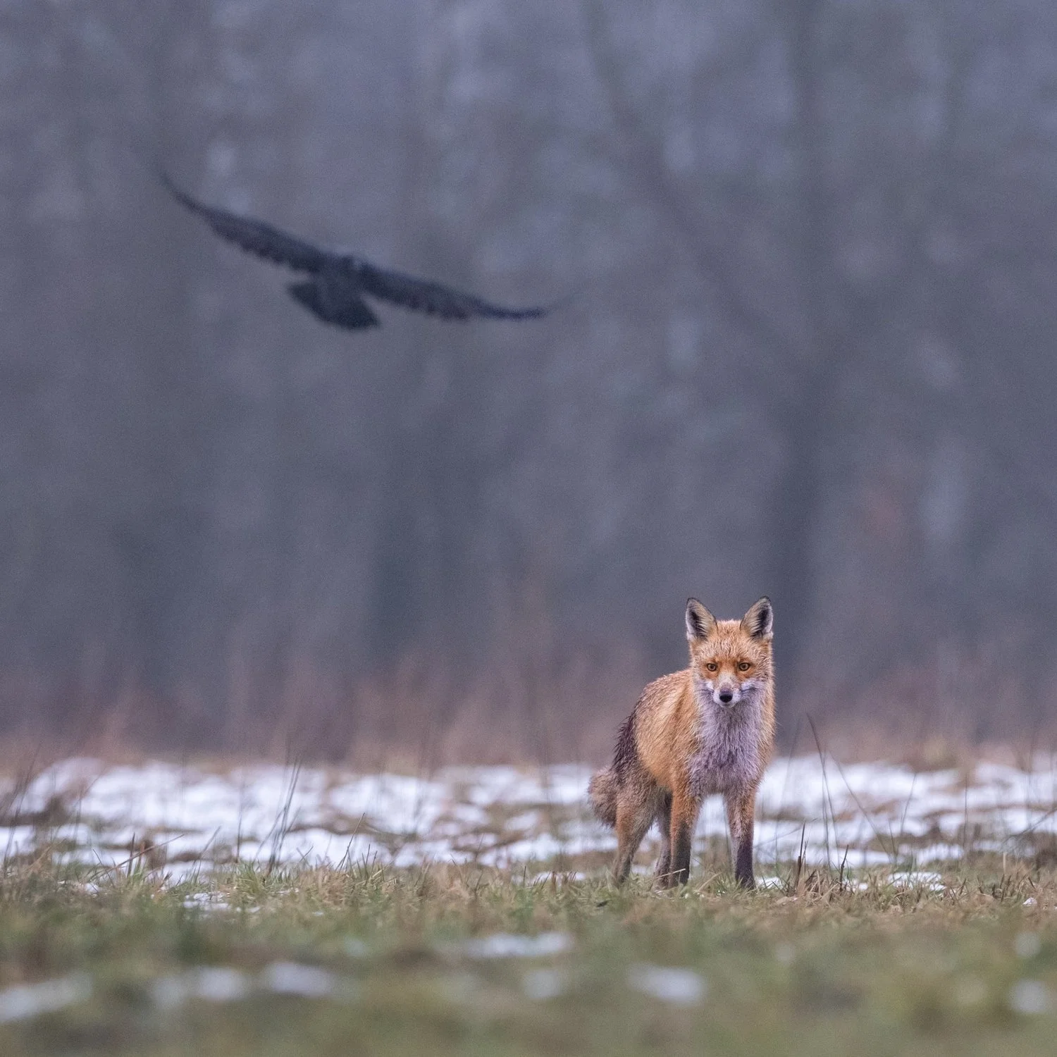Darn crow strikes again! I’m up in the Białowieża forest, on the boarder of Poland & Belarus, when suddenly this Red Fox shows up. Totally unexpected it looks like a juvenile and as I get ready to capture its image, wouldn’t you know it, but a crow shows up!