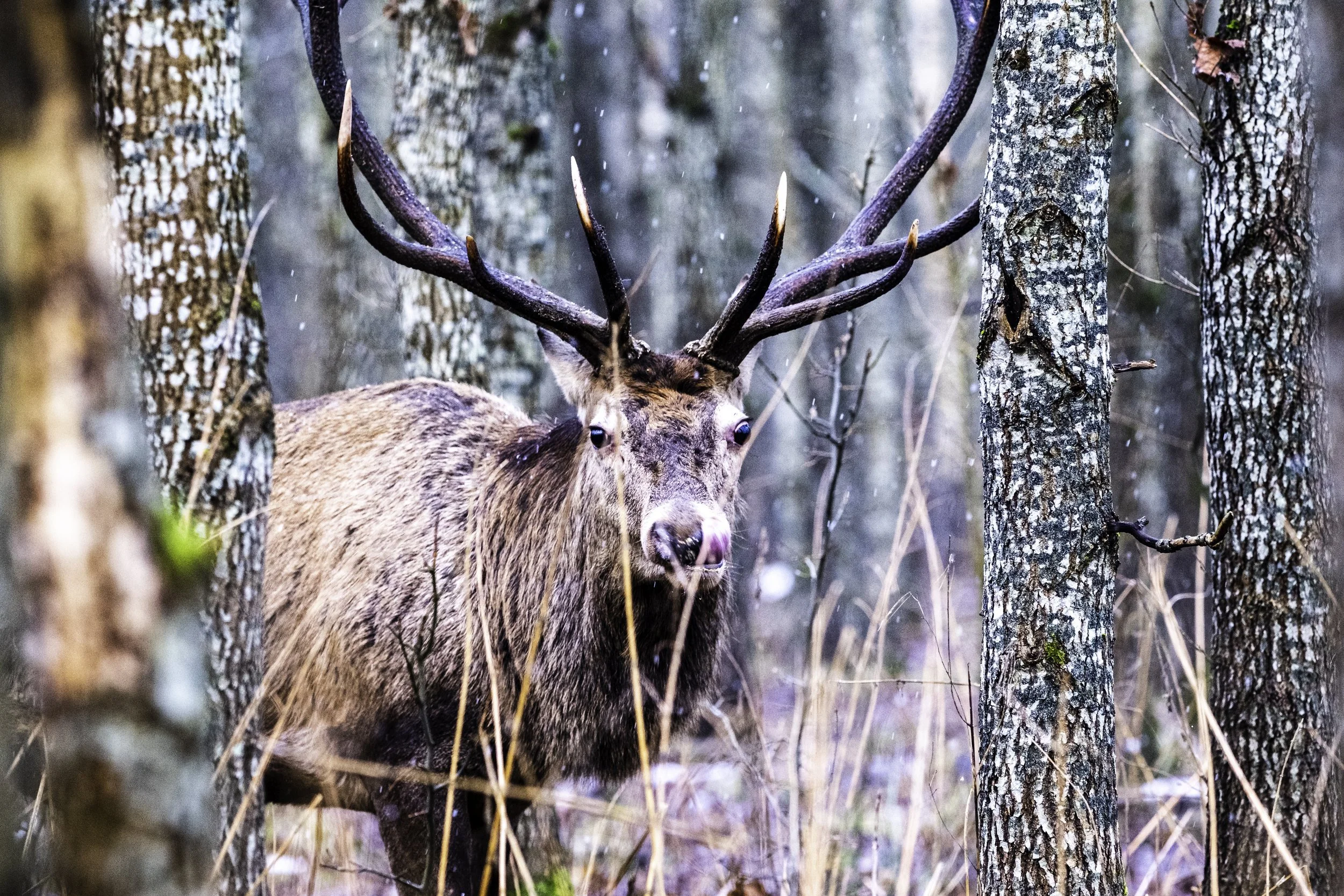 The snow was starting to fall as we drove into the Białowieża forest. Located in Northern Poland, close to the boarder with Belarus, the forest is the largest primeval forest left. At one point it was the hunting grounds for Tzars and Kings. Now it is a reserve of the enjoyment of all, and a safe haven for animals. I was out looking to photograph European Bison, the largest mammal in Europe.